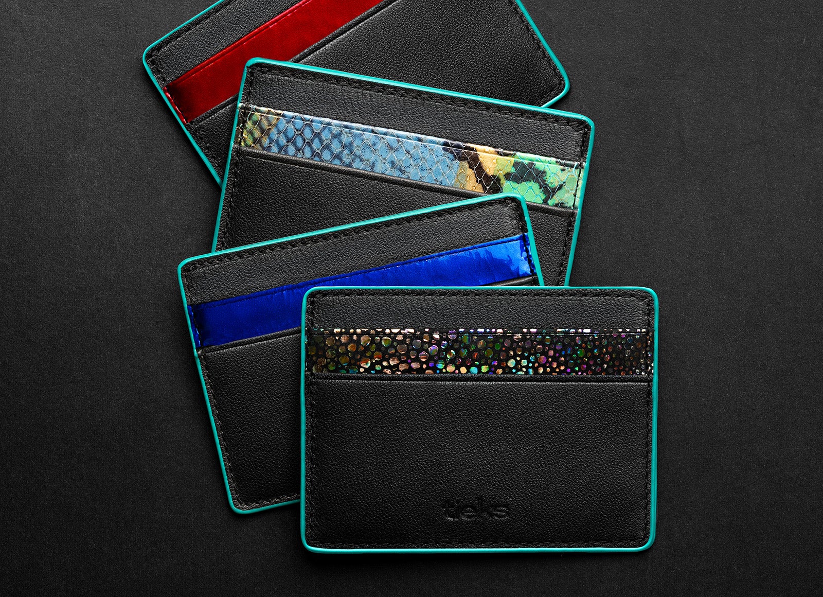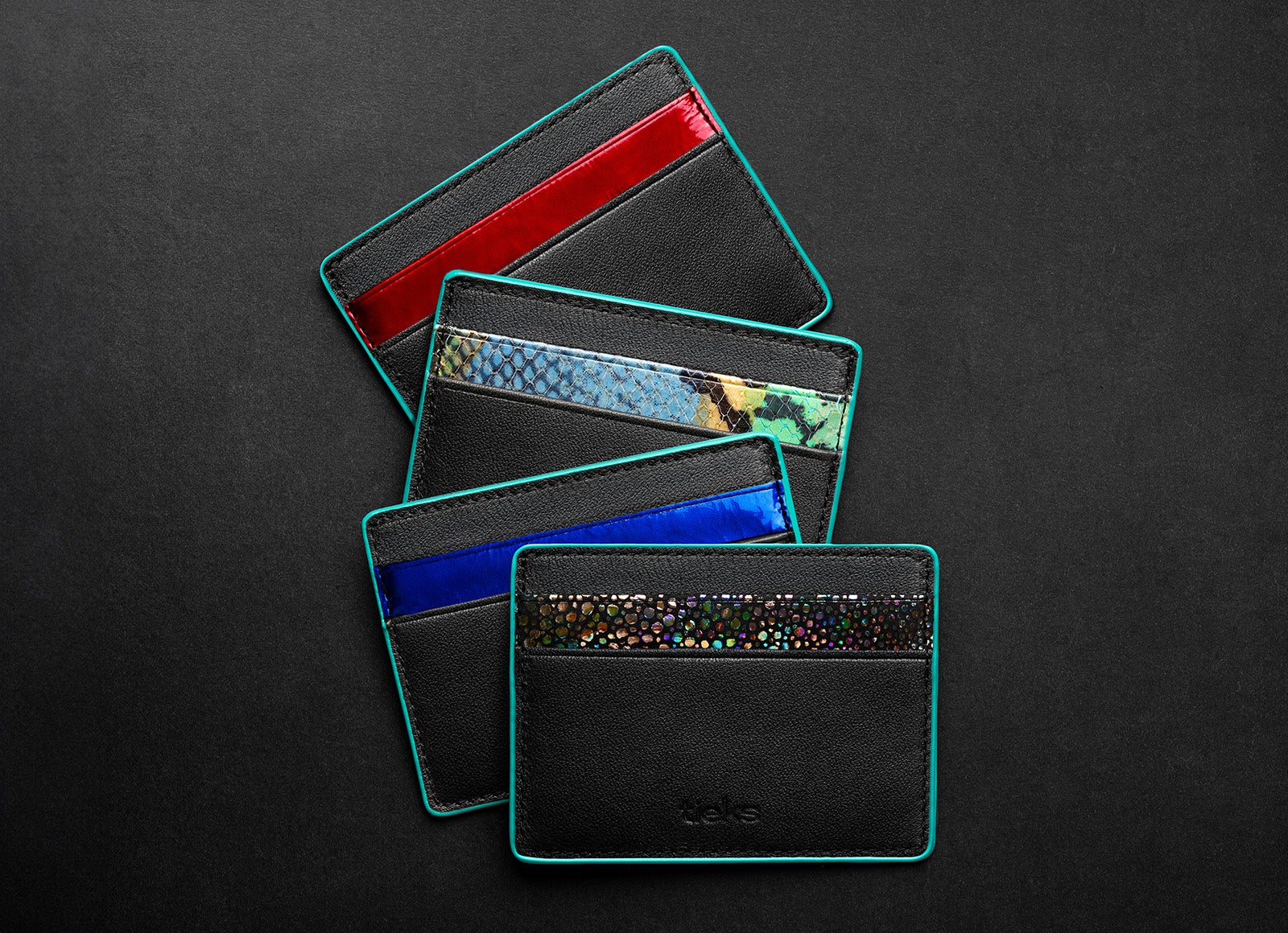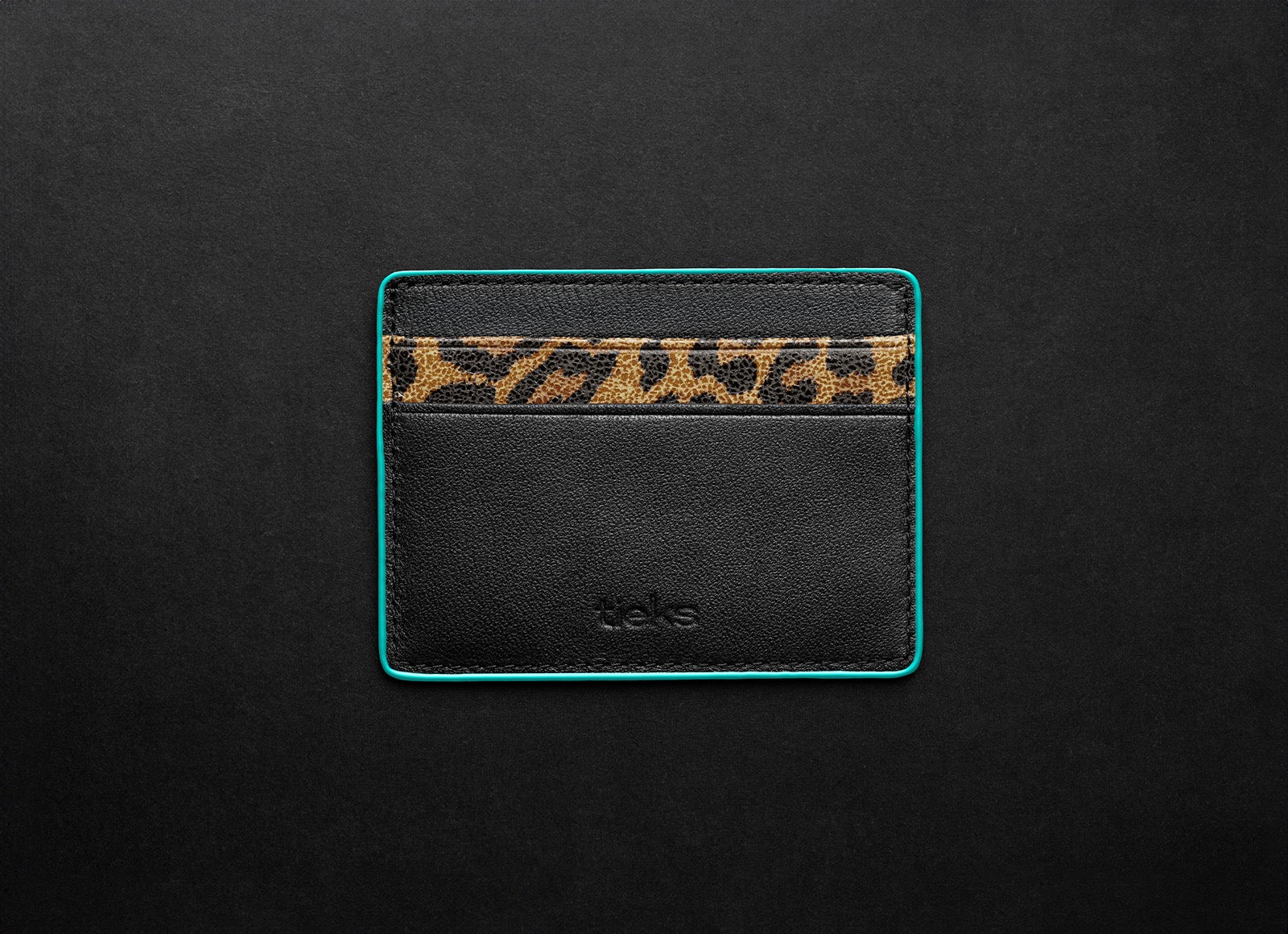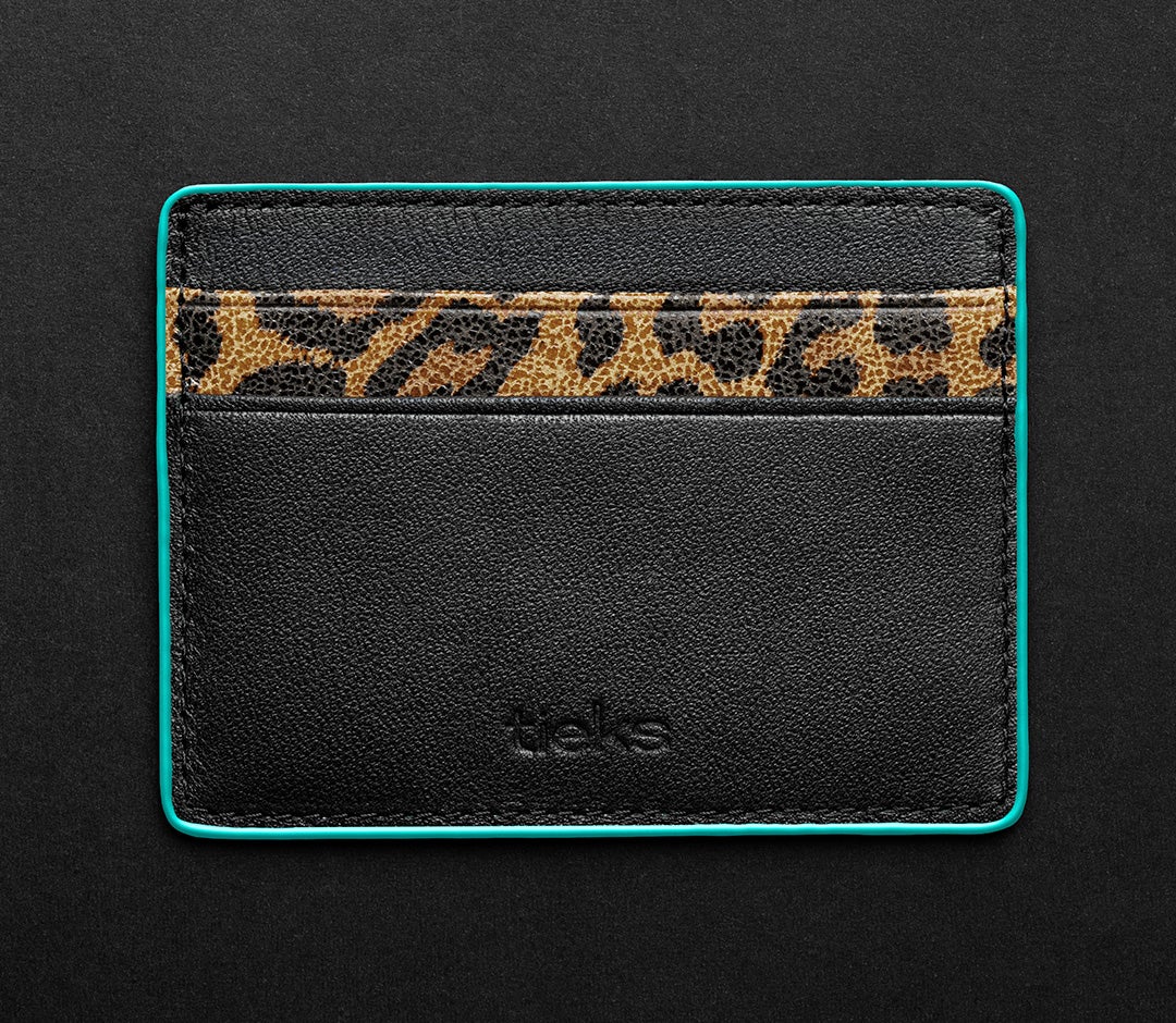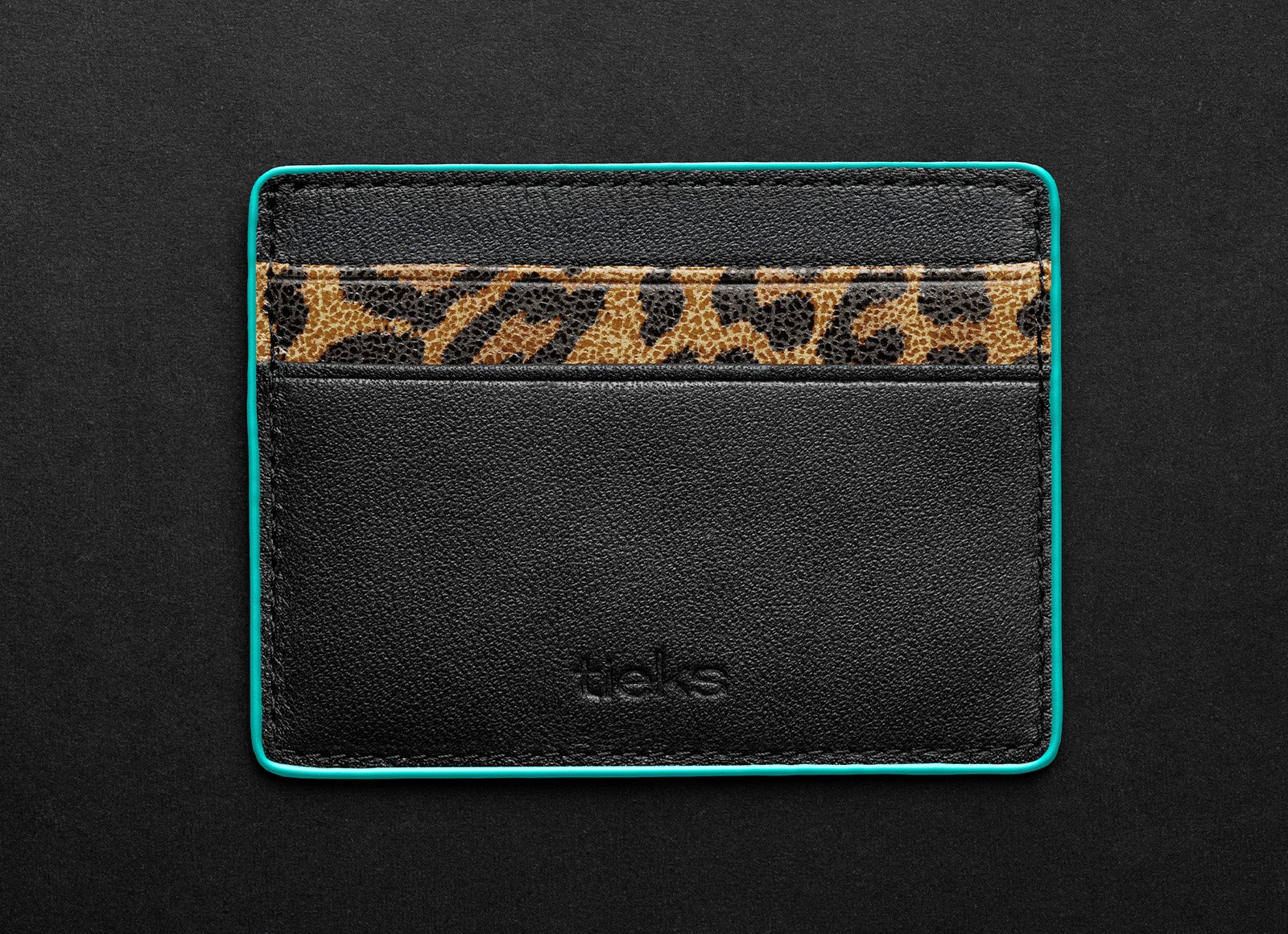 Crafted with our signature Italian artistry and leathers and modern design, the Tieks Card Case features a soft yet durable full-grain Matte Black leather exterior, Tiek Blue trim, and a band of leather in the color of your choice. Four exterior card slots and a center pocket hold your essentials in a sleek, chic silhouette.