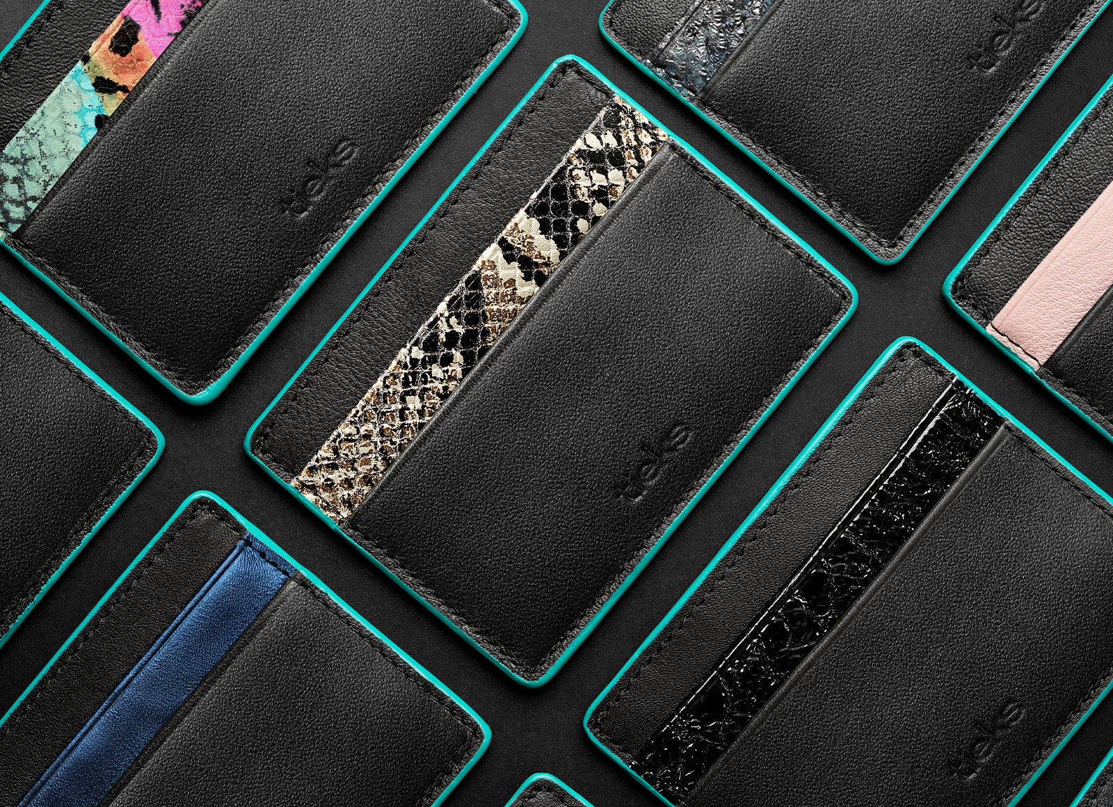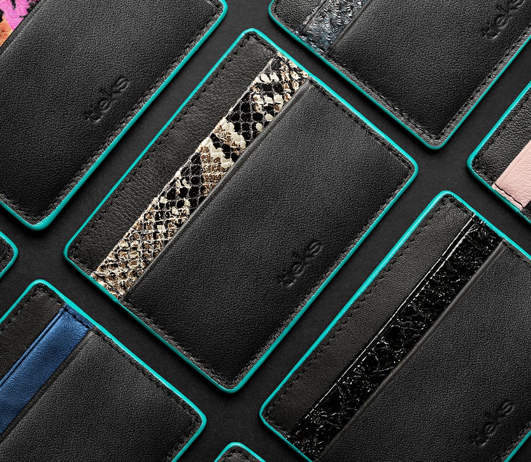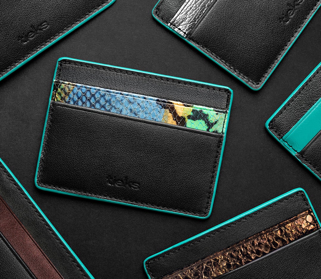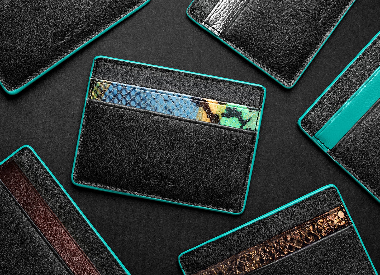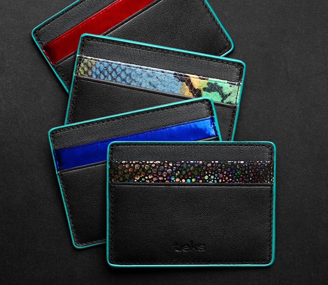 Crafted with our signature Italian artistry and leathers and modern design, the Tieks Card Case features a soft yet durable full-grain Matte Black leather exterior, Tiek Blue trim, and a band of leather in the color of your choice. Four exterior card slots and a center pocket hold your essentials in a sleek, chic silhouette.