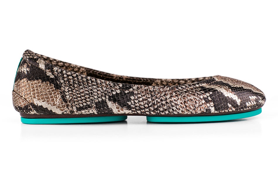 Add exotic elegance to your look in Copperhead Snake Tieks. Hues of copper, silver, and black are combined to create a luxurious, shimmering snake print. Inspired by the mysterious beauty of the copperhead snake, these Tieks are a standout neutral for every season.
