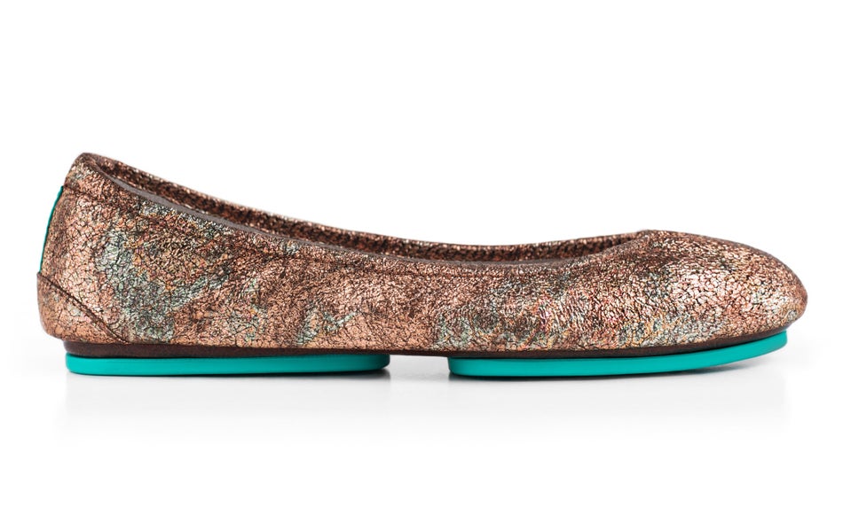 Our Starstruck, Lovestruck, and Moonstruck Tieks are crafted from soft, Italian leather that is pressed with a delicate foil, then tumbled to give the leather a crackled, antiqued appearance. The leather is unique in that it has a subtle, iridescent pattern which gives the leather an uncommonly brilliant shine with a unique pattern. The warm, metallic luster of these leathers create a dazzle that the typical glitter leather cannot match.