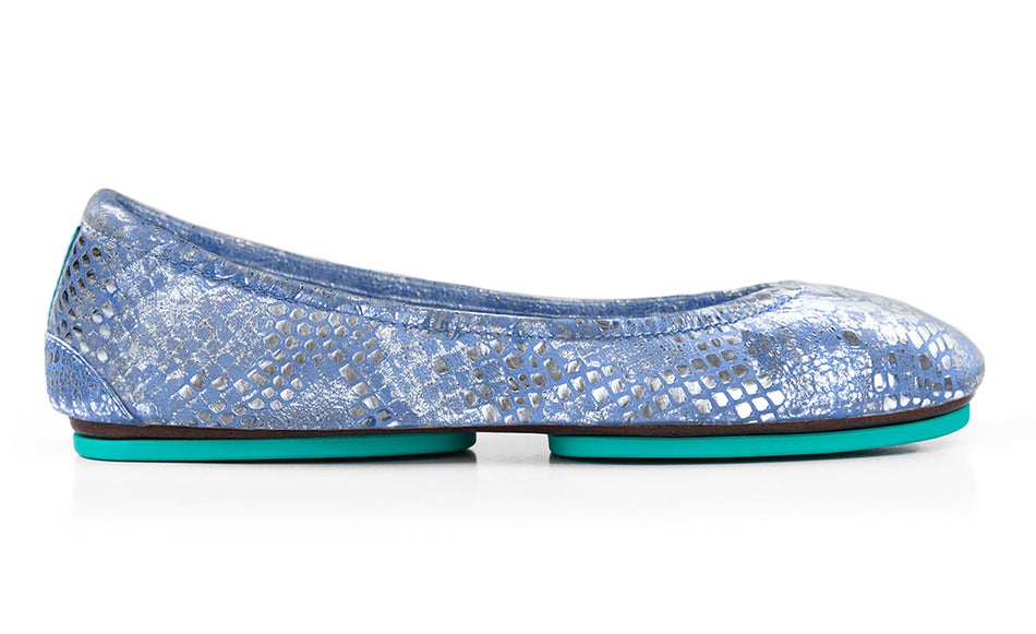 This glamorous collection features our Romantic Blush, Wild Copper, and Paradise Blue Tieks. Each of these Italian leathers features a unique snake print on split leather. After the leathers are painted by hand, reflective gold and silver foil accents are individually placed to add an unparalleled sparkle unique to this collection. At least five sets of skilled artisan hands work on each piece of leather, making this one of our most special collections. As a result, no two pairs of Tieks made from these leathers are exactly alike.