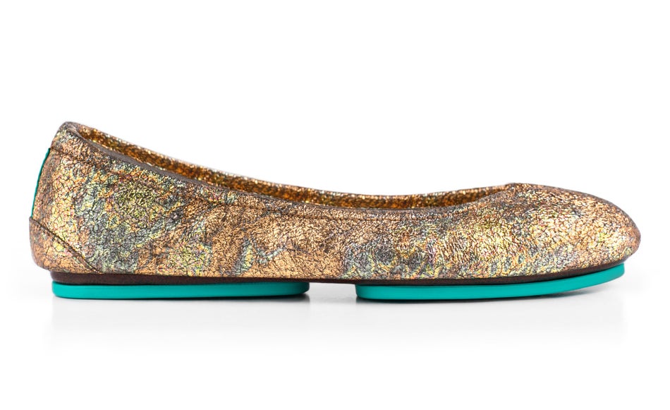 Our Starstruck, Lovestruck, and Moonstruck Tieks are crafted from soft, Italian leather that is pressed with a delicate foil, then tumbled to give the leather a crackled, antiqued appearance. The leather is unique in that it has a subtle, iridescent pattern which gives the leather an uncommonly brilliant shine with a unique pattern. The warm, metallic luster of these leathers create a dazzle that the typical glitter leather cannot match.