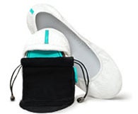 Each pair of Tieks comes with a reusable nylon tote in our signature Tiek Blue color. The tote unfolds into a perfectly sized travel bag to transport your heels (or anything else) when you're on the go.